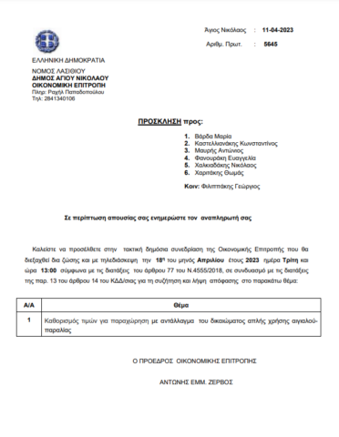 Πρόσκληση σε συνεδρίαση της Οικονομικής Επιτροπής την Τρίτη 18/04/2023 και ώρα 13:00
