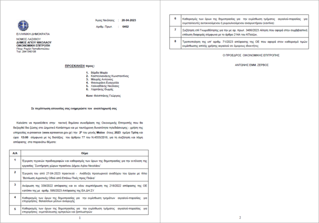 Πρόσκληση σε συνεδρίαση της Οικονομικής Επιτροπής την Τρίτη 02/05/2023 και ώρα 13:00