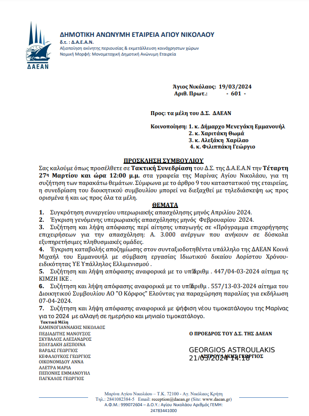 Τακτική Συνεδρίαση του Δ.Σ. της Δ.Α.Ε.Α.Ν την Τέταρτη 27η Μαρτίου και ώρα 12:00 μ.μ.