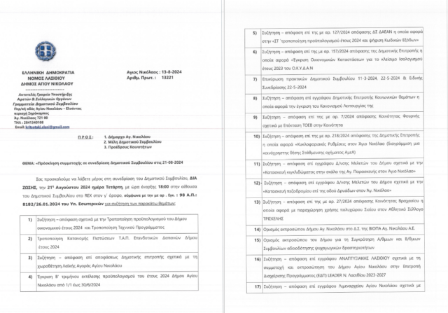 Συνεδρίαση Δημοτικού Συμβουλίου Δήμου Αγίου Νικολάου. Τετάρτη 21-08-2024 και ώρα 18:00