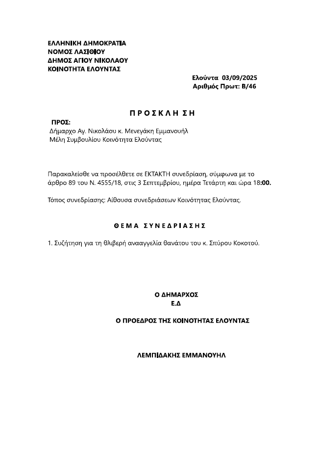 Πρόσκληση Έκτακτης Συνεδρίασης Κοινότητας Ελούντας. Τετάρτη 03/09/2025 και ώρα 18:00