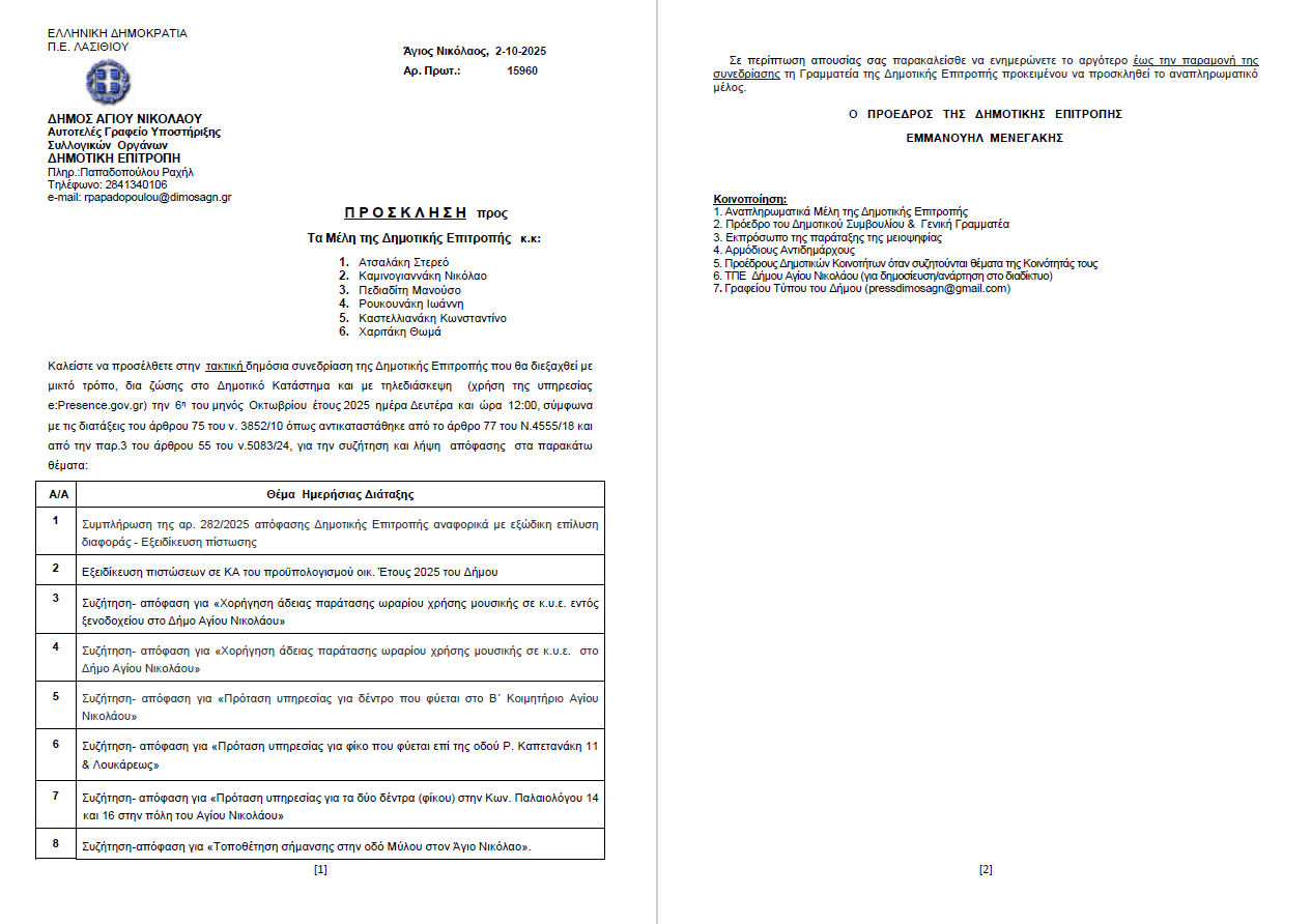 Συνεδρίαση Δημοτικής Επιτροπής Δήμου Αγίου Νικολάου. Δευτέρα 06-10-2025 και ώρα 12:00