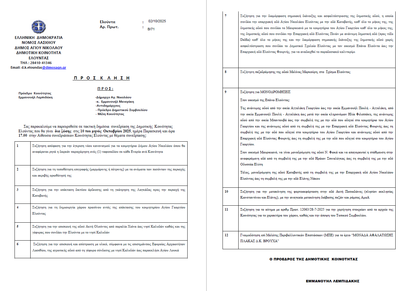 Πρόσκληση Συνεδρίασης Δημοτικής Κοινότητας Ελούντας. Παρασκευή 10/10/2025 και ώρα 17:00