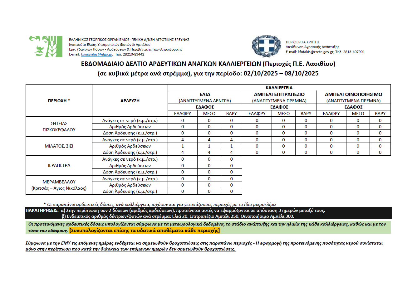 Εβδομαδιαίο Δελτίο Αρδευτικών Αναγκών Καλλιεργειών για την περίοδο 02/10/2025 – 08/10/2025