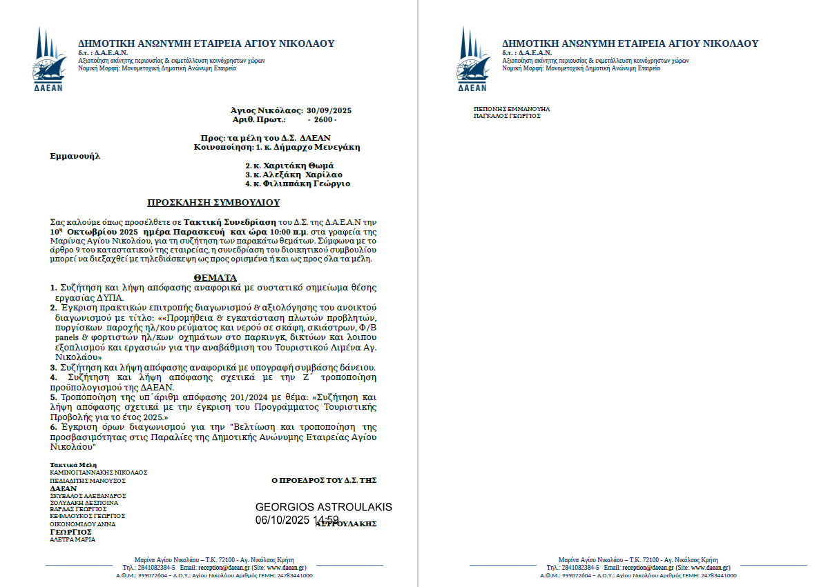 Τακτική Συνεδρίαση ΔΑΕΑΝ για την Παρασκευή 10/10/2025 και ώρα 10:00 π.μ