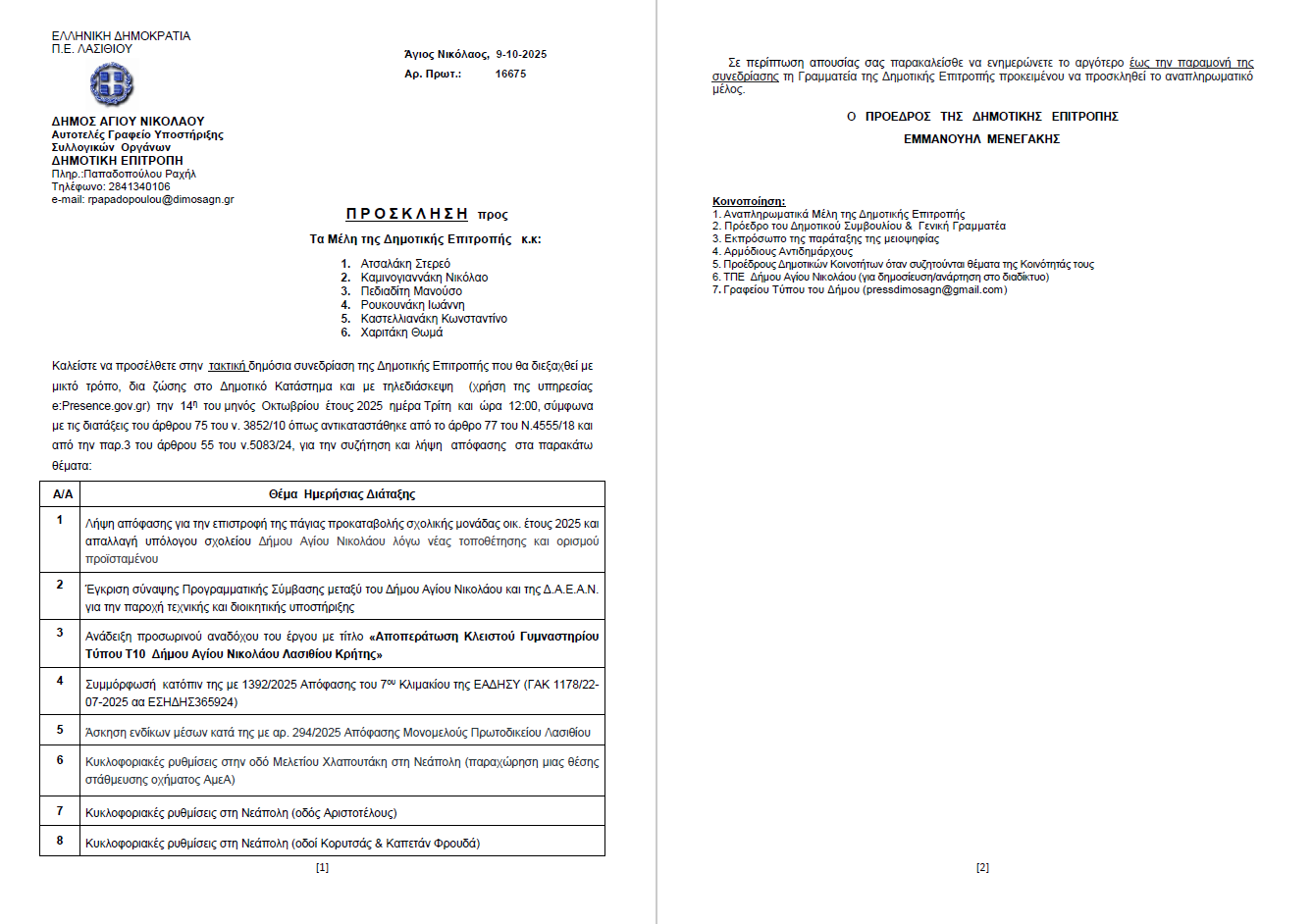 Συνεδρίαση Δημοτικής Επιτροπής Δήμου Αγίου Νικολάου. Τρίτη 14-10-2025 και ώρα 12:00