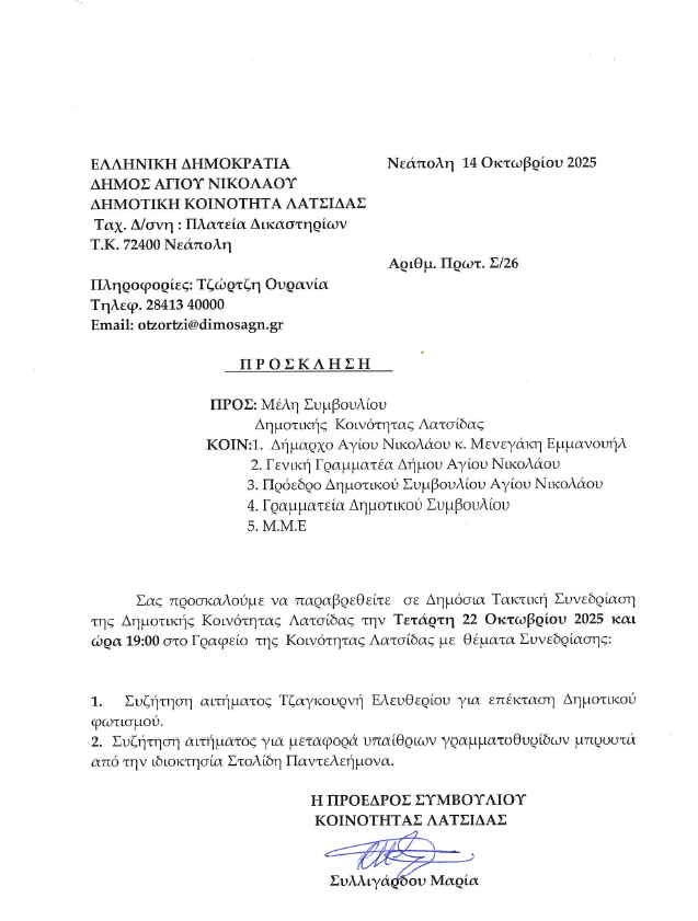 Πρόσκληση Συνεδρίασης Δημοτικής Κοινότητας Λατσίδας. Τετάρτη 22-10-2025 και ώρα 19:00