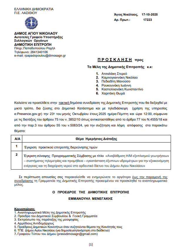 Συνεδρίαση Δημοτικής Επιτροπής Δήμου Αγίου Νικολάου. Πέμπτη 23-10-2025 και ώρα 12:00