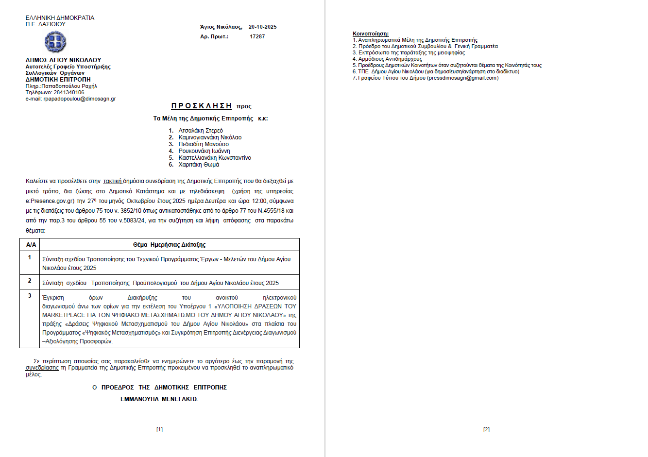 Συνεδρίαση Δημοτικής Επιτροπής Δήμου Αγίου Νικολάου. Δευτέρα 27-10-2025 και ώρα 12:00