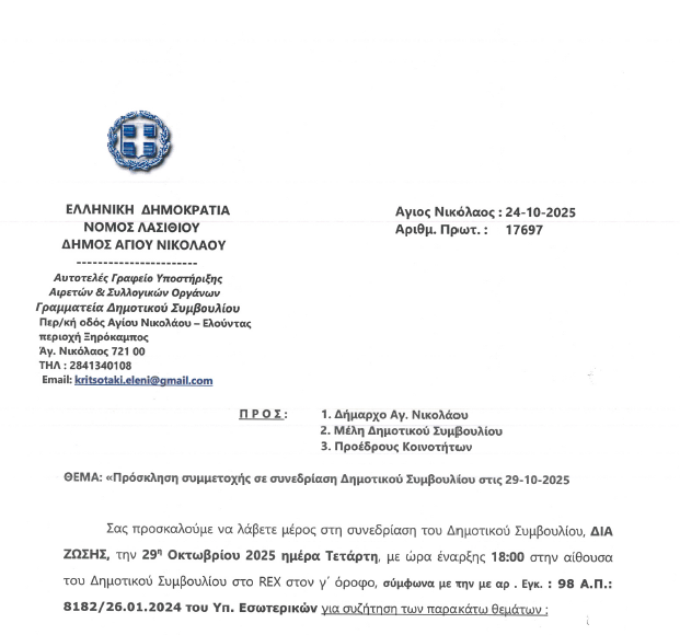 Συνεδρίαση Δημοτικού Συμβουλίου Δήμου Αγίου Νικολάου. Τετάρτη 29/10/2025 και ώρα 18:00