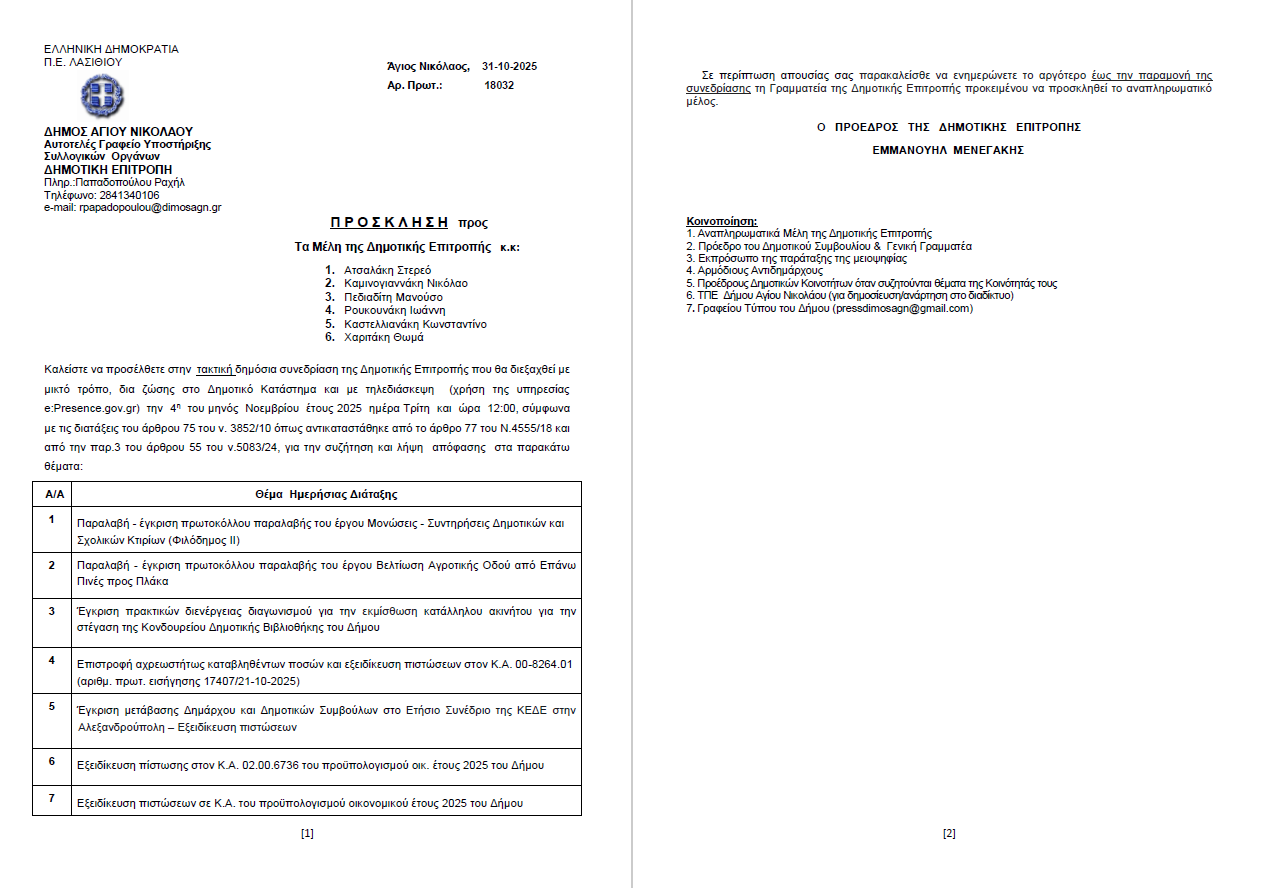 Συνεδρίαση Δημοτικής Επιτροπής Δήμου Αγίου Νικολάου. Τρίτη 04-11-2025 και ώρα 12:00