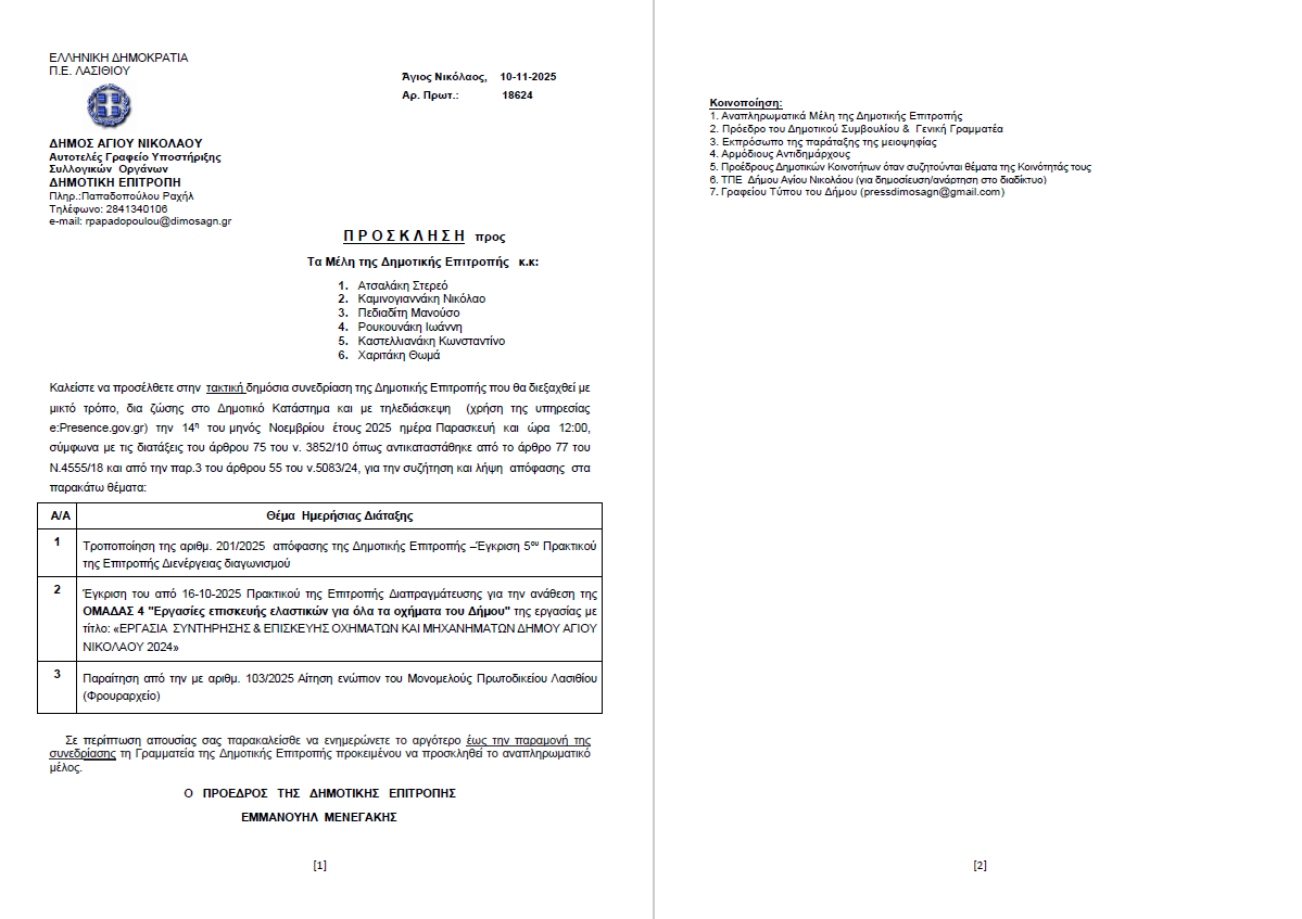 Συνεδρίαση Δημοτικής Επιτροπής Δήμου Αγίου Νικολάου. Παρασκευή 14-11-2025 και ώρα 12:00