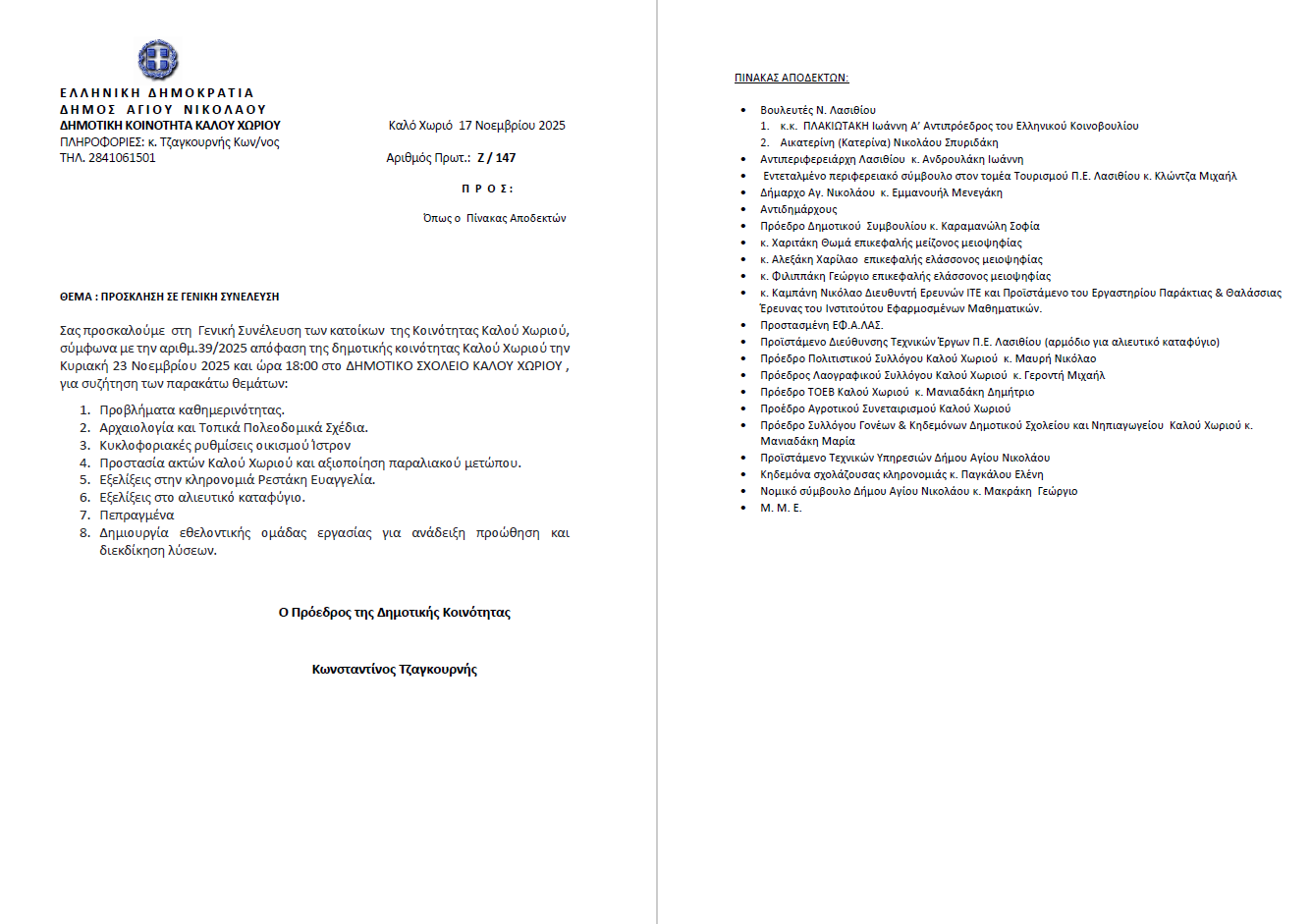 Πρόσκληση σε ΕΙΔΙΚΗ δημόσια συνεδρίαση του Δημοτικού Συμβουλίου Αγίου Νικολάου. Τετάρτη 3 Δεκεμβρίου 2025και ώρα 17:00 17 Νοεμβρίου, 2025