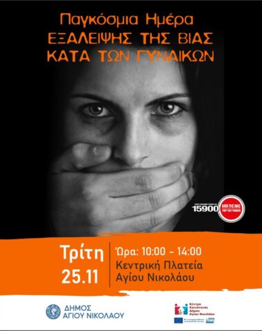 Με αφορμή την Παγκόσμια Ημέρα για την Εξάλειψη της Βίας κατά των Γυναικών (25 Νοεμβρίου), το Τμήμα Κοινωνικής Προστασίας και Παιδείας και το Κέντρο Κοινότητας Δήμου Αγίου Νικολάου διοργανώνουν δράσεις ενημέρωσης και ευαισθητοποίησης του κοινού στις 21-24-25/11 & 3-4/12/ 2025.