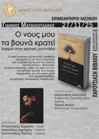 Σας προσκαλούμε στην παρουσίαση του βιβλίου με τίτλο «Ο νους μου τα βουνά κρατεί» δοκίμιο στην κρητική μαντινάδα του Γιάννη Ματθαιουδάκη, η οποία θα πραγματοποιηθεί την Πέμπτη 27 Νοεμβρίου και ώρα 19:00 στο Επιμελητήριο Λασιθίου.