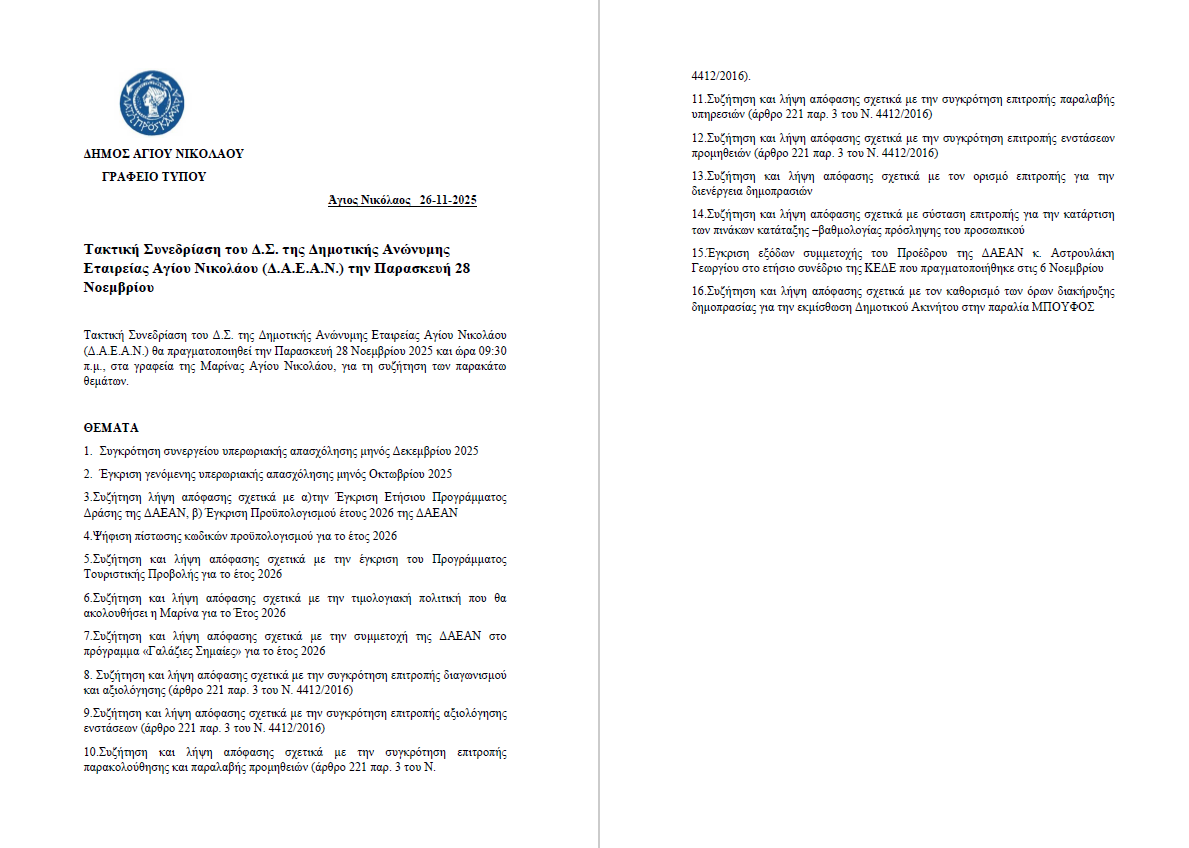 Τακτική Συνεδρίαση ΔΑΕΑΝ για την Παρασκευή 28/11/2025 και ώρα 09:30 π.μ 26 Νοεμβρίου, 2025