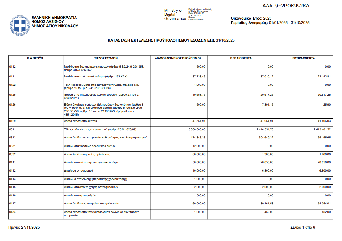 Στοιχεία Εκτέλεσης Προϋπολογισμού Ν.3861/2010, Άρθρου 10α Μηνός Οκτωβρίου 2025 27 Νοεμβρίου, 2025