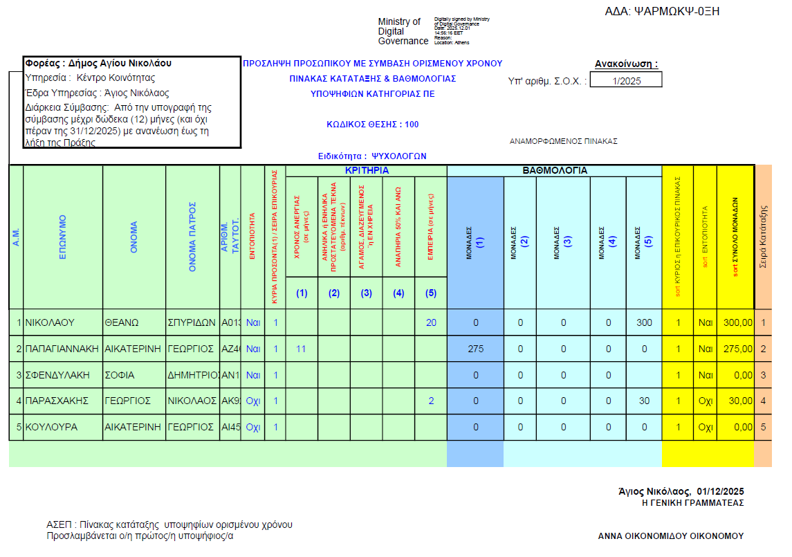 Δημοσίευση αναμορφωμένου πίνακα κατάταξης ΣΟΧ 1/2025 ειδικότητα: Π.Ε. Ψυχολόγων