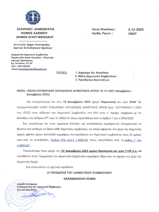 Ειδική Συνεδρίαση Λογοδοσίας Δημοτικής Αρχής (Νοεμβρίου – Δεκεμβρίου 2025) Παρασκευή 19 Δεκεμβρίου 2025 και ώρα 18:00