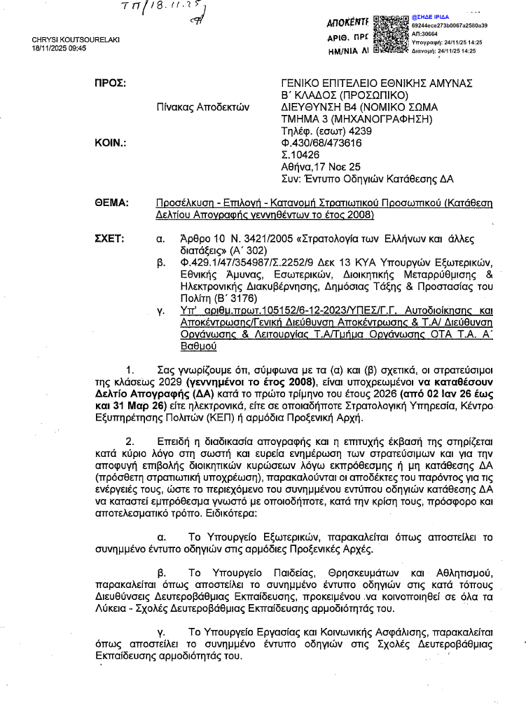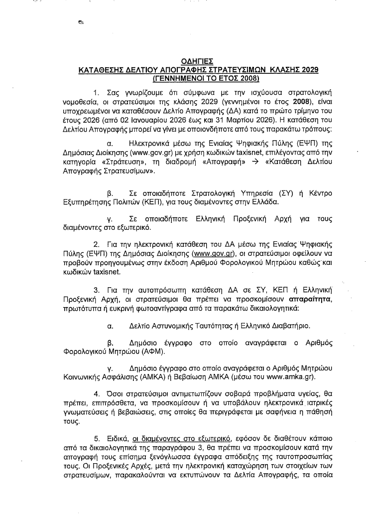Προσέλκυση-Επιλογή-Κατανομή Στρατιωτικού Προσωπικού (Κατάθεση Δελτίου Απογραφής γεννηθέντων το έτος 2008)