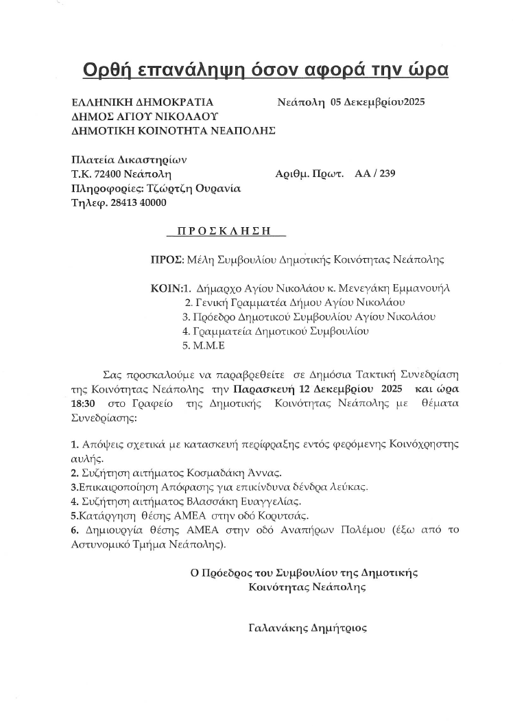 Πρόσκληση συνεδρίασης Δημοτικής Κοινότητας Νεάπολης. Παρασκευή 12-12-2025 και ώρα 18:30
