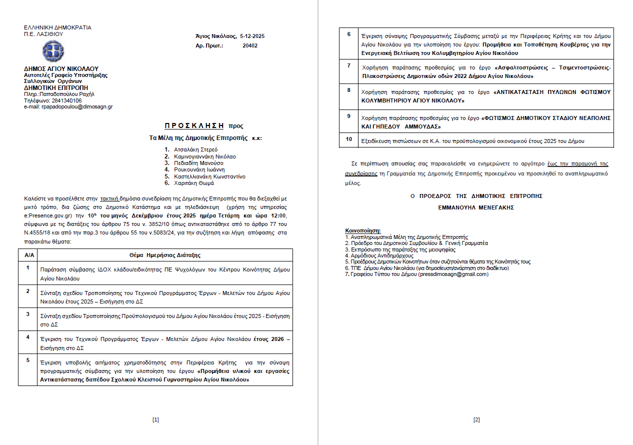 Συνεδρίαση Δημοτικής Επιτροπής Δήμου Αγίου Νικολάου. Τετάρτη 10-12-2025 και ώρα 12:00 π.μ.