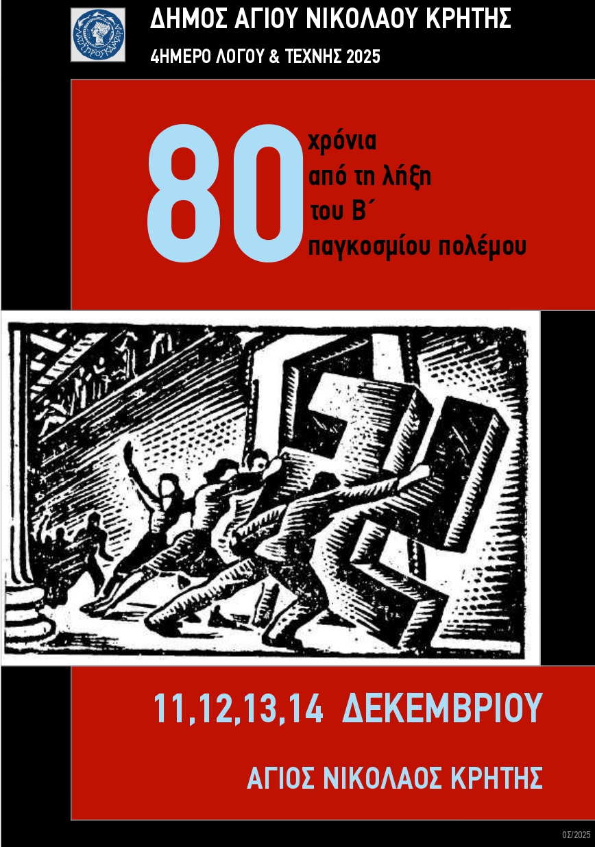 Με αφορμή τη φετινή συμπλήρωση 80 χρόνων από τη λήξη του Β΄ Παγκοσμίου Πολέμου, ο Δήμος Αγίου Νικολάου διοργανώνει στις 11, 12, 13 & 14 Δεκεμβρίου το «Τετραήμερο Λόγου και Τέχνης», που θα περιλαμβάνει εκθέσεις φωτογραφίας, εισηγήσεις για θέματα Ιστορίας, Λόγου, Τέχνης και Μνήμης, που θα πλαισιωθούν από συναυλία, θεατρικό αναλόγιο και προβολή ταινίας.