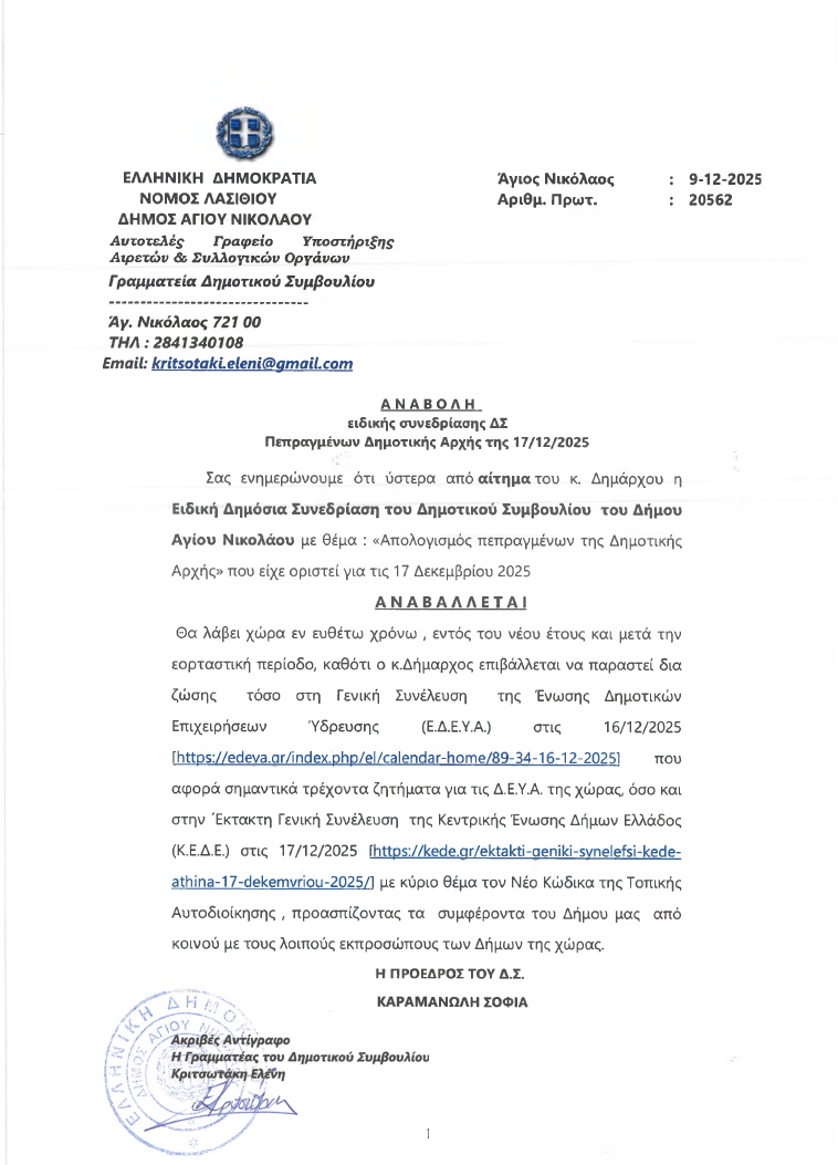 Συνεδρίαση Δημοτικής Ανώνυμης Εταιρείας Αγίου Νικολάου. Παρασκευή 12 Δεκεμβρίου 2025 στις 9:30 π.μ. 9 Δεκεμβρίου, 2025
