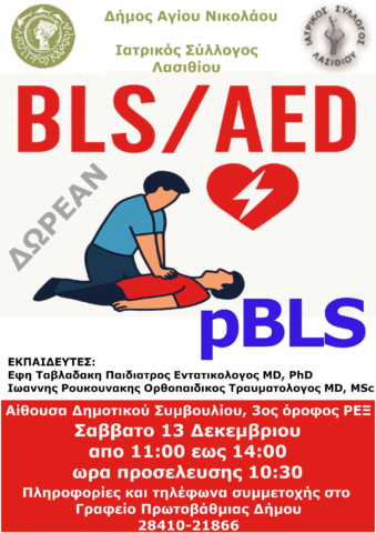 Το Γραφείο Πρωτοβάθμιας Υγείας του Τμήματος Κοινωνικής Προστασίας & Παιδείας Δήμου Αγίου Νικολάου σε συνεργασία με τον Ιατρικό Σύλλογο Λασιθίου στο πλαίσιο των δράσεων προαγωγής της υγείας και ενίσχυσης της ετοιμότητας των πολιτών σε καταστάσεις επείγουσας ανάγκης ενημερώνει, ότι συνεχίζονται και τον μήνα Δεκέμβριο τα εκπαιδευτικά σεμινάρια για την Καρδιοπνευμονική Αναζωογόνηση (ΚΑΡΠΑ), την χρήση Αυτόματου Εξωτερικού Απινιδωτή (AED), την αντιμετώπιση Πνιγμονής από ξένο σώμα και τη θέση Ανάνηψης για ενήλικες και παιδιά.