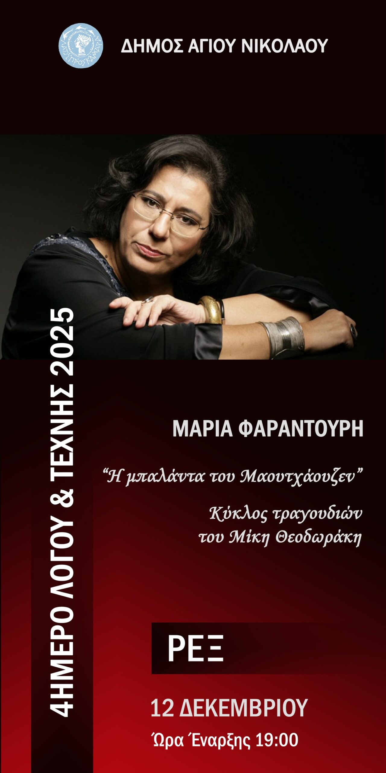 Με αυτά τα λόγια, η Μαρία Φαραντούρη μας προσκαλεί στη συναυλία της το βράδυ της Παρασκευής 12 Δεκεμβρίου στη σκηνή του Κινηματοθέατρου REX, στο πλαίσιο της 2ης Ημέρας του “Τετραημέρου Λόγου και Τέχνης” που διοργανώνεται από τον Δήμο στον Άγιο Νικόλαο Κρήτης, με αφορμή τη φετινή συμπλήρωση 80 χρόνων από τη λήξη του Β΄ Παγκοσμίου Πολέμου.