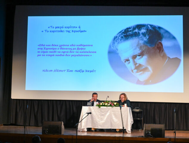 Οι λογοτεχνικές αναφορές της φιλολόγου κ. Μαρίας Κωστάκη στο ιαπωνικό τραύμα του πυρηνικού ολέθρου, προετοίμασαν το έδαφος για το συμβολικό κλείσιμο της εκδήλωσης από Ερασιτεχνική Θεατρική Ομάδα Αγίου Νικολάου (ΕΘΟΑΝ), που παρουσίασε σε θεατρικό αναλόγιο το λογοτεχνικό έργο της Εντίτα Μόρρις «Τα Λουλούδια της Χιροσίμα», μια βαθιά συγκινητική καλλιτεχνική κατάθεση μνήμης και ανθρωπιάς, αποσπώντας το θερμό χειροκρότημα του κοινού.