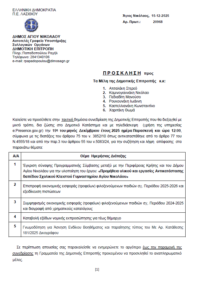 Συνεδρίαση Δημοτικής Επιτροπής Δήμου Αγίου Νικολάου. Παρασκευή 19-12-2025 και ώρα 12:00