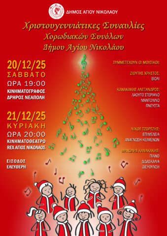 Χριστουγεννιάτικες μελωδίες και τραγούδια των ημερών φιλοξενεί το εορταστικό πρόγραμμα του Δήμου Αγίου Νικολάου σε δυο συναυλίες που θα πραγματοποιηθούν στα κινηματοθέατρα «Δρήρος» και «REX» με τα Χορωδιακά Σύνολα του Δήμου Αγίου Νικολάου.