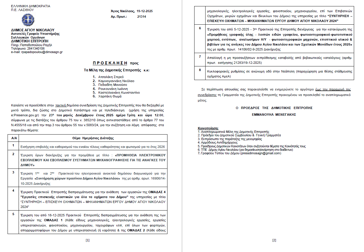 Συνεδρίαση Δημοτικής Επιτροπής Δήμου Αγίου Νικολάου. Τρίτη 23-12-2025 και ώρα 12:00