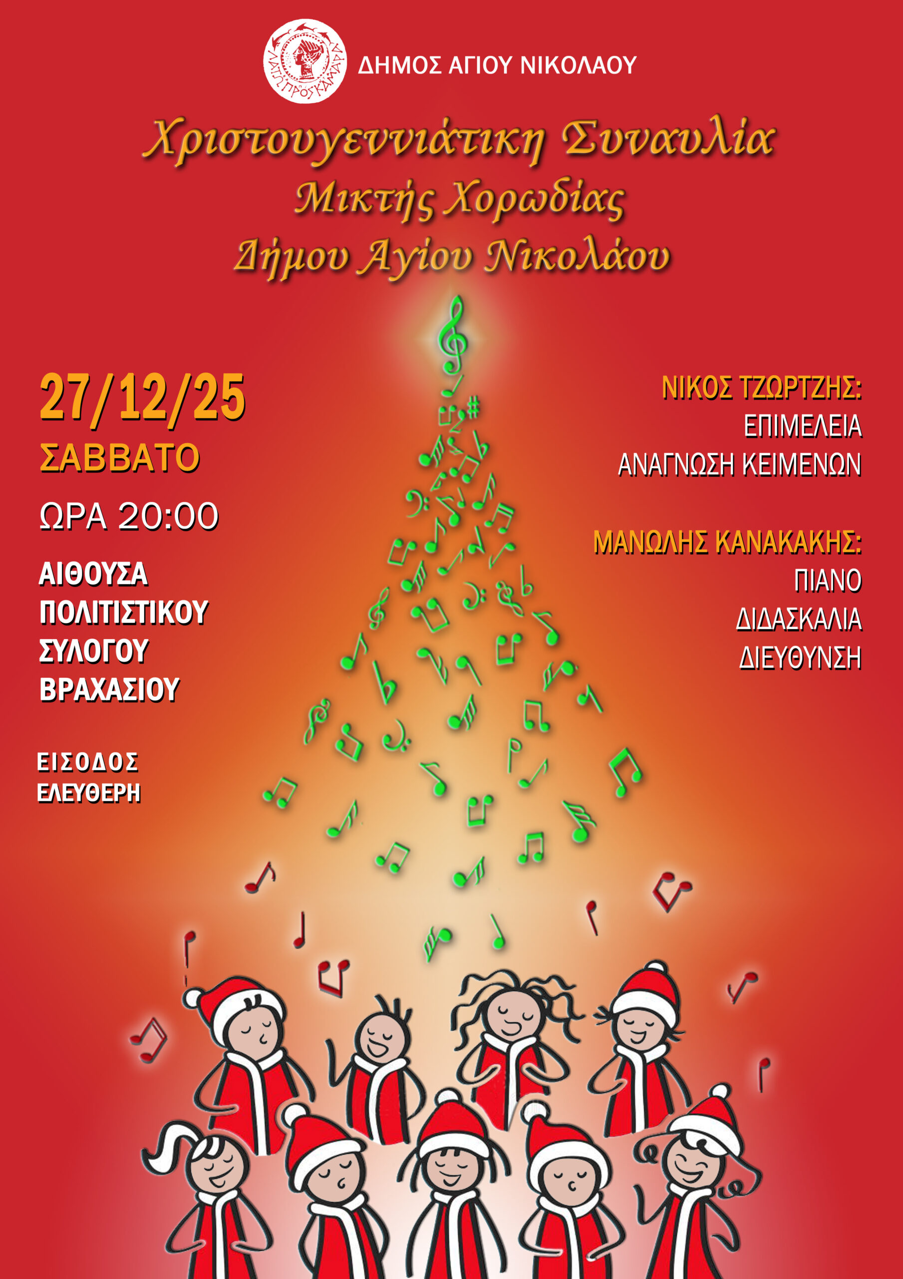 Χριστουγεννιάτικες μελωδίες κάλαντα και τραγούδια των ημερών θα παρουσιαστούν στην Συναυλία της Μικτής Χορωδίας του Δήμου Αγίου Νικολάου που θα πραγματοποιηθεί στο Βραχάσι (αίθουσα Πολιτιστικού Συλλόγου) το Σάββατο 27 Δεκεμβρίου 2025.
