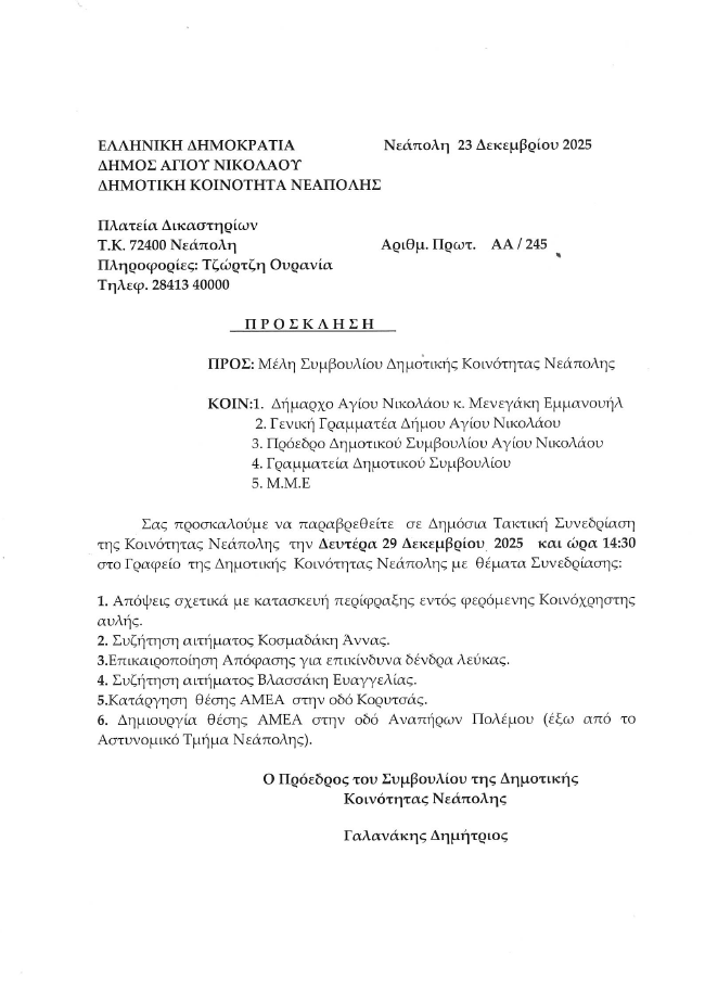 Πρόσκληση συνεδρίασης Δημοτικής Κοινότητας Νεάπολης. Δευτέρα 23-12-2025 και ώρα 14:30