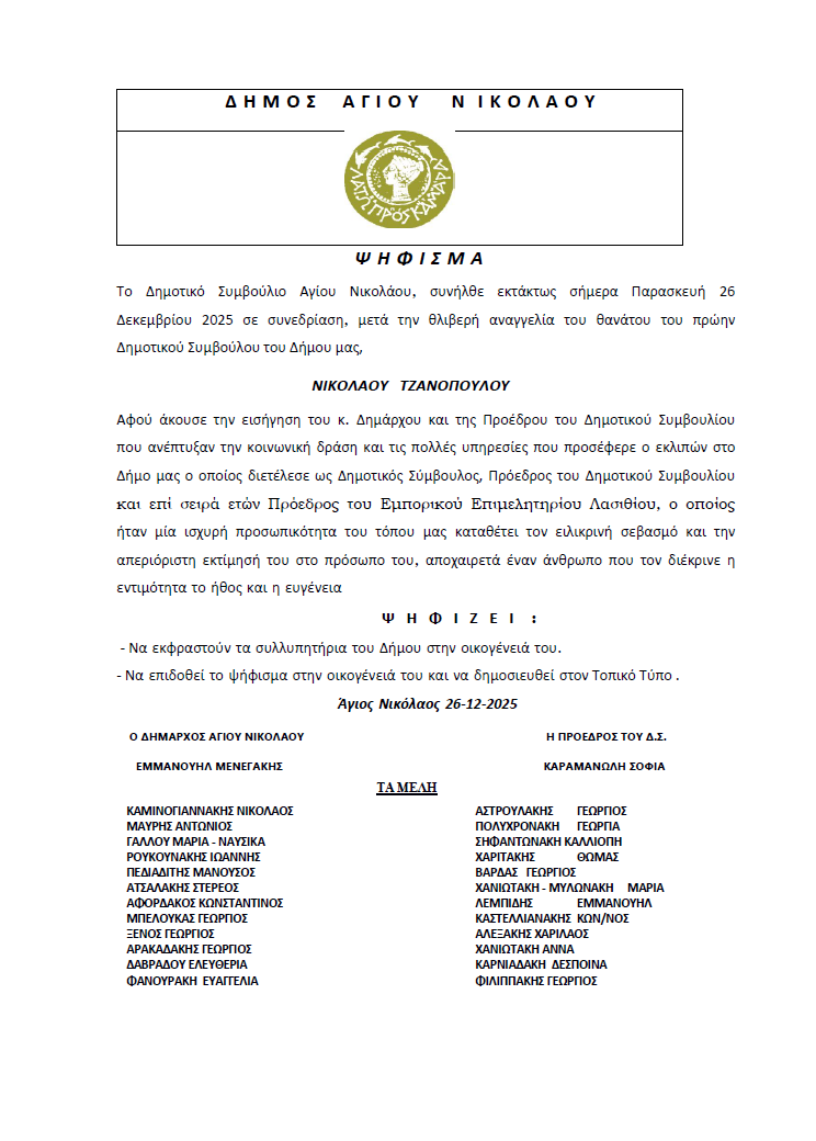 Ψήφισμα Δημοτικού Συμβουλίου Αγίου Νικολάου για την εκδημία του Νίκου Τζανόπουλου