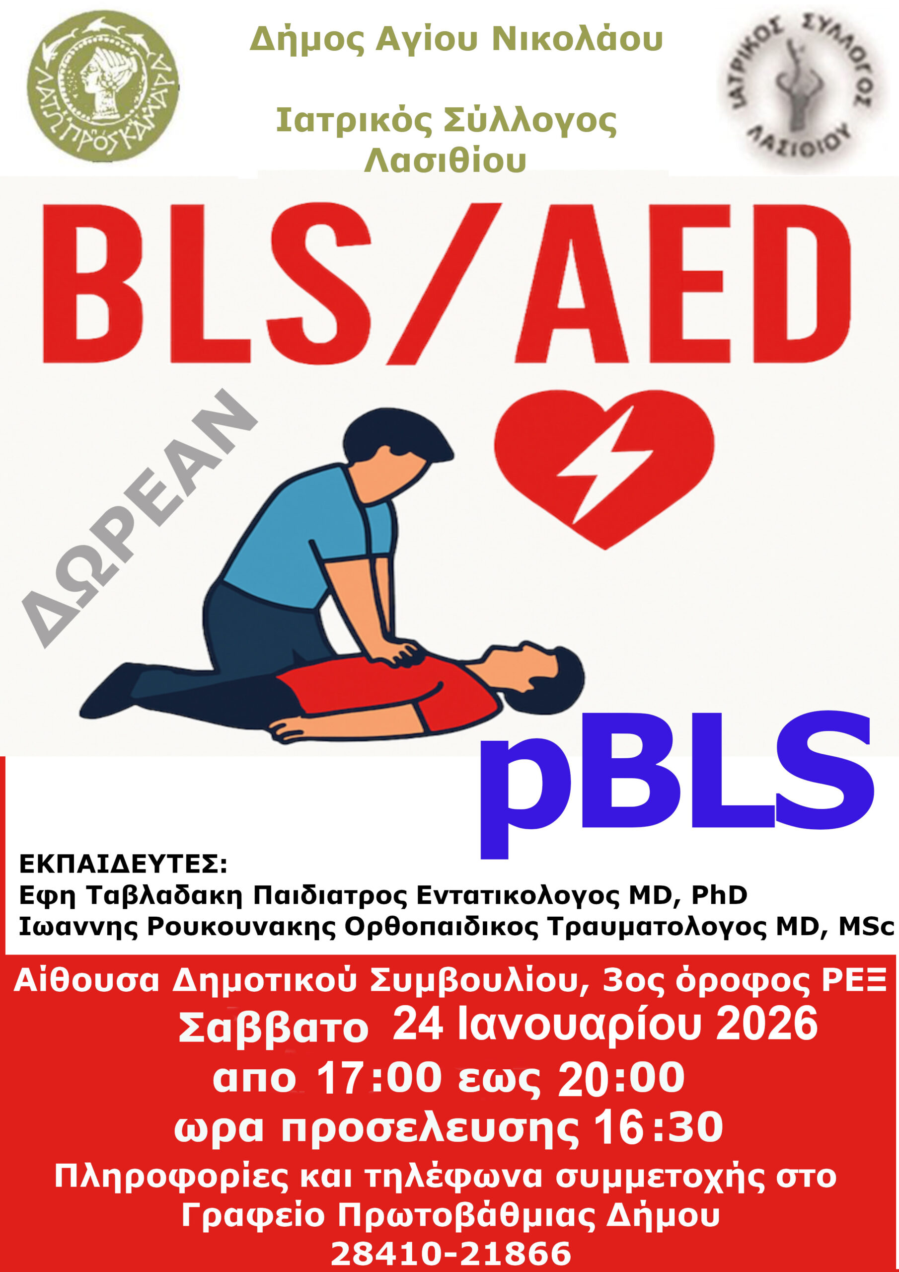 Ο Δήμος Αγίου Νικολάου σε συνεργασία με τον Ιατρικό Σύλλογο Λασιθίου στο πλαίσιο των δράσεων προαγωγής υγείας και ενίσχυσης της ετοιμότητας των πολιτών σε καταστάσεις επείγουσας ανάγκης ενημερώνει ότι συνεχίζονται και τον μήνα Ιανουάριο τα εκπαιδευτικά σεμινάρια για την Καρδιοπνευμονική Αναζωογόνηση (ΚΑΡΠΑ), την χρήση Αυτόματου Εξωτερικού Απινιδωτή (AED), την αντιμετώπιση Πνιγμονής από ξένο σώμα και τη θέση Ανάνηψης για παιδιά και ενήλικες.