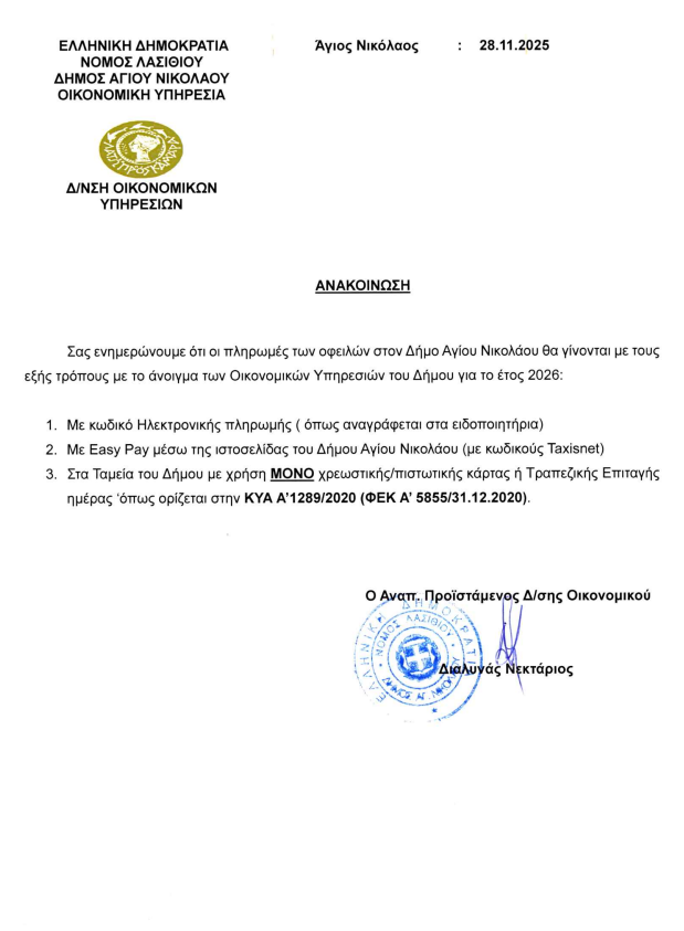 Γραμμή επικοινωνίας με το Δήμο Αγίου Νικολάου 15454 (χρέωση ανάλογα με τον τιμοκατάλογο του τηλεφωνικού σας παρόχου), ή 2841340100