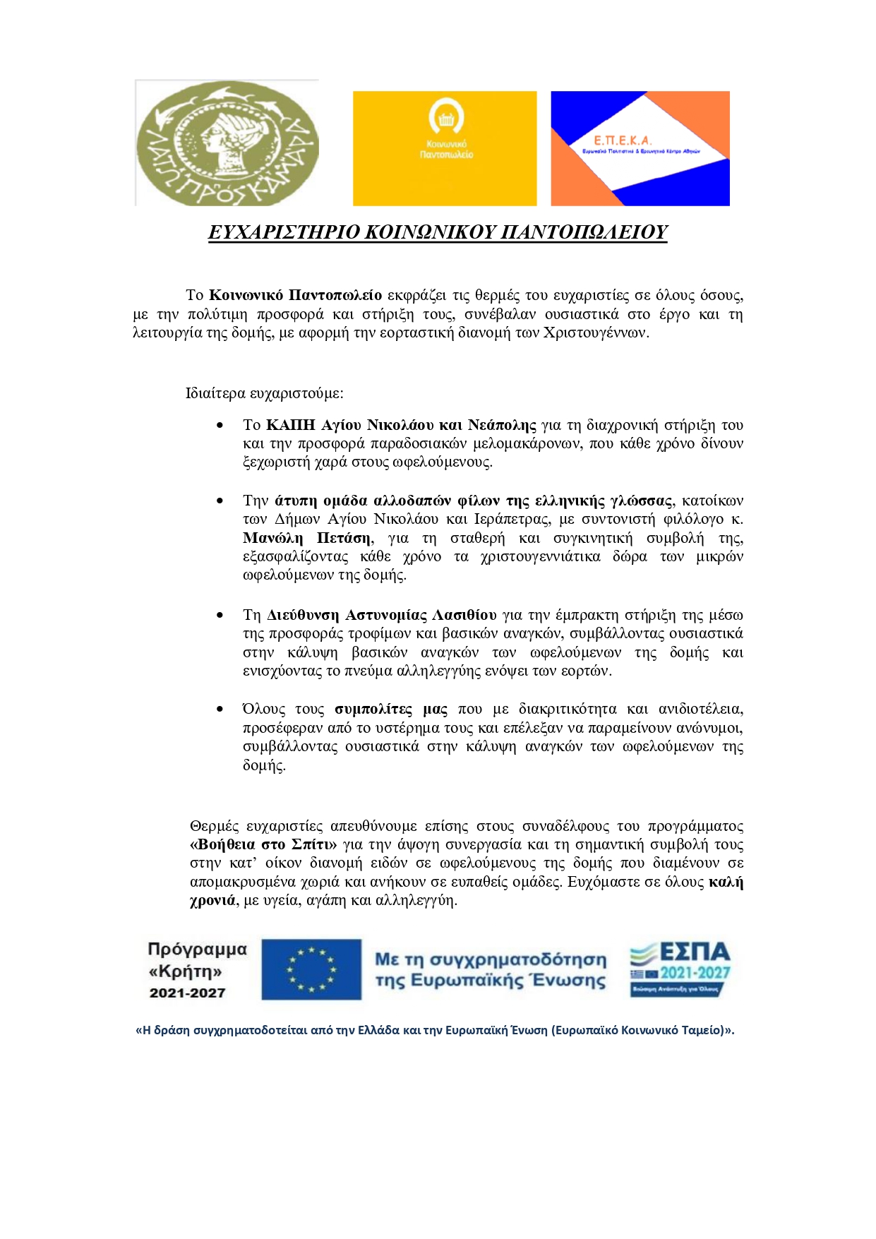 Ευχαριστήριο Κοινωνικού Παντοπωλείου Δήμου Αγίου Νικολάου για την εορταστική διανομή των Χριστουγέννων 26 Ιανουαρίου, 2026