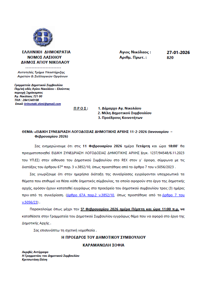 Ειδική Συνεδρίαση Λογοδοσίας Δημοτικής Αρχής. Τετάρτη 11-02-2026 και ώρα 18:00 27 Ιανουαρίου, 2026