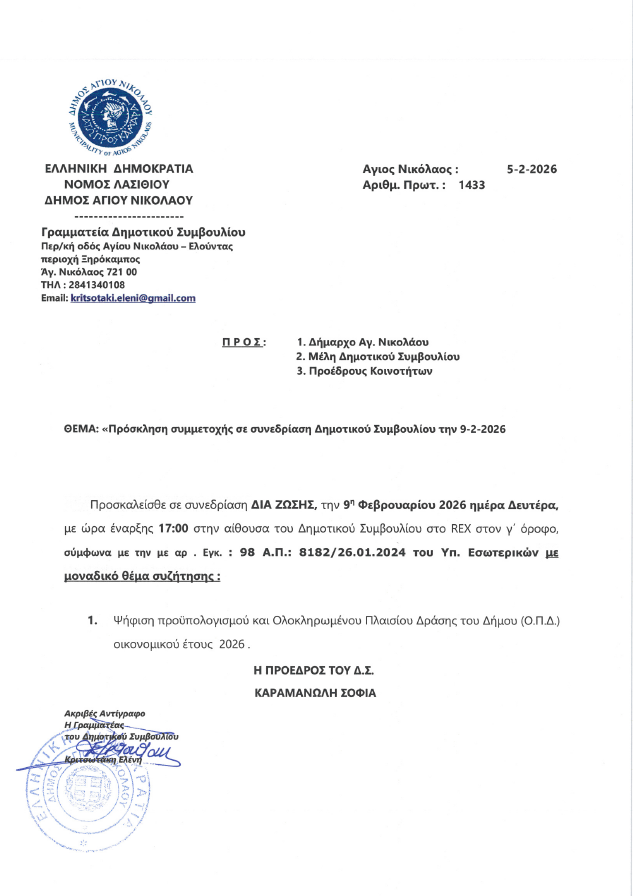 Πρόσκληση συμμετοχής σε συνεδρίαση Δημοτικού Συμβουλίου στις 9-2-2026 – Ψήφιση προϋπολογισμού 2026