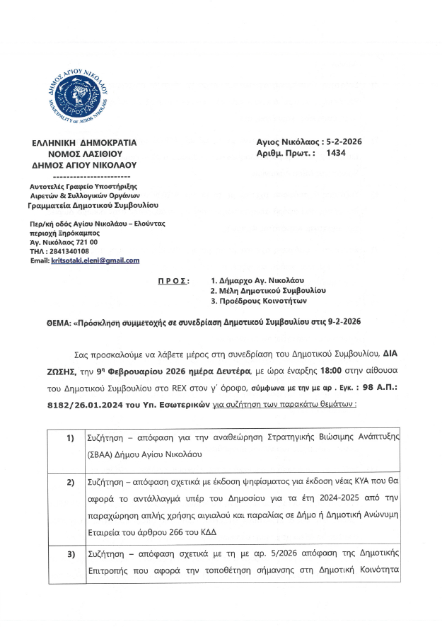 Πρόσκληση συμμετοχής σε συνεδρίαση Δημοτικού Συμβουλίου στις 9-2-2026 5 Φεβρουαρίου, 2026