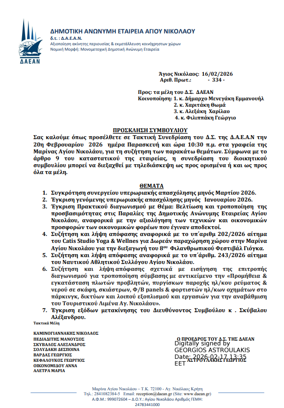 Τακτική Συνεδρίαση ΔΑΕΑΝ για την Παρασκευή 20/02/2026 και ώρα 10:30 π.μ.