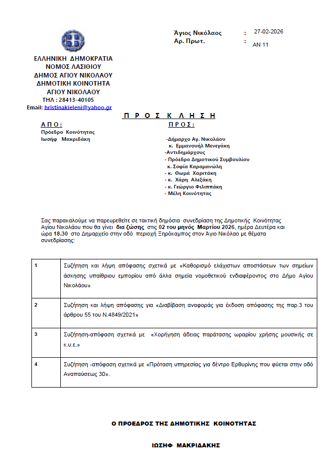 Πρόσκληση για Τακτική Συνεδρίαση της Δημοτικής Κοινότητας Καλού Χωριού. Δευτέρα 02-03-2026 και ώρα 18:30