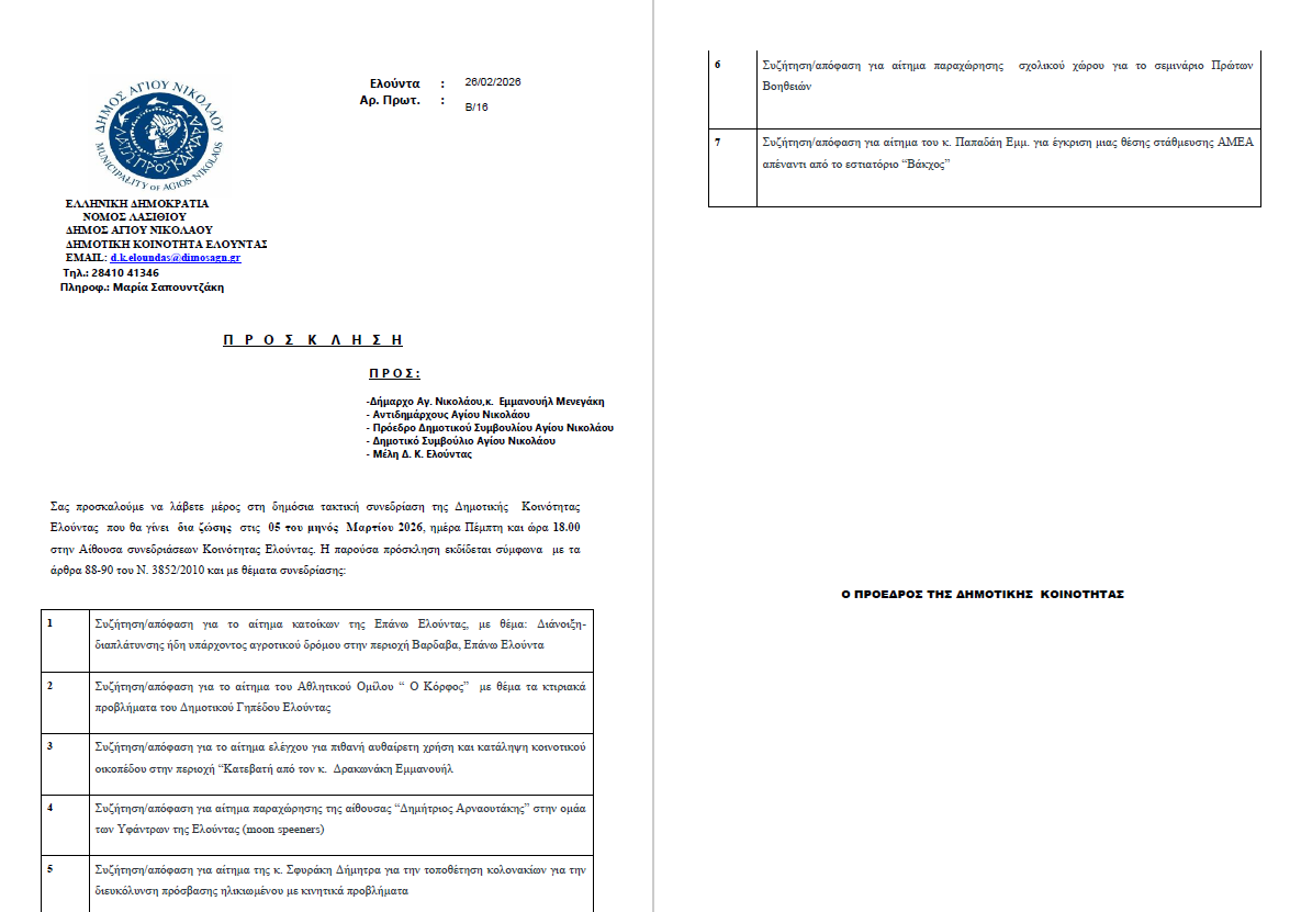 Πρόσκληση Συνεδρίασης Δημοτικής Κοινότητας Ελούντας. Πέμπτη 05/03/2026 και ώρα 18:00