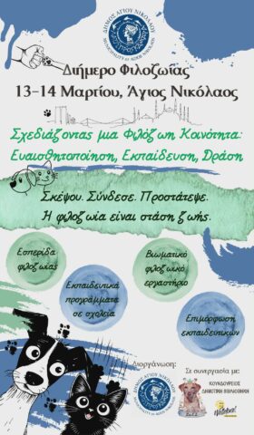 Ο Δήμος Αγίου Νικολάου διοργανώνει την Παρασκευή 13 και το Σάββατο 14 Μαρτίου 2026 διημερίδα αφιερωμένη στη φιλοζωία, με τίτλο «Σχεδιάζοντας μια Φιλόζωη Κοινότητα», αναδεικνύοντας τη σημασία της εκπαίδευσης, της πρόληψης και της συνεργασίας για τη σωστή διαχείριση των αδέσποτων ζώων συντροφιάς.