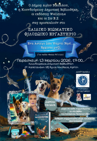 Το απόγευμα, στις 17:00, στην Κουνδούρειο Δημοτική Βιβλιοθήκη στον Άγιο Νικόλαο (Ρ. Καπετανάκη 18), θα πραγματοποιηθεί παιδικό βιωματικό φιλοζωικό εργαστήριο για νήπια και προνήπια (ηλικίας 4-6 ετών) με τίτλο: «Ένα Αδέσποτο Ζώο Ψάχνει Νησί… Έρχεσαι μαζί;». Το εργαστήριο θα υλοποιηθεί από τις εκδόσεις Welldone και τις Ζωοφιλικές Ενημερώσεις Σχολείων, Ιδρυμάτων & Οργανισμών (Ζω.Ε.Σ.).