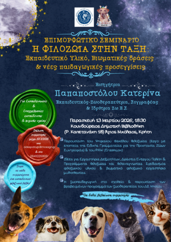 Παράλληλα, στις 18:30, θα πραγματοποιηθεί επιμορφωτικό σεμινάριο με τίτλο «Η ΦΙΛΟΖΩΙΑ ΣΤΗΝ ΤΑΞΗ: Εκπαιδευτικό Υλικό, Βιωματικές δράσεις & νέες παιδαγωγικές προσεγγίσεις», για εκπαιδευτικούς όλων των βαθμίδων και επαγγελματίες εκπαίδευσης και ψυχικής υγείας, με έμφαση στη σύνδεση της φιλοζωίας και της ζωοθεραπείας με τη σύγχρονη παιδαγωγική πρακτική και τα Εργαστήρια Δεξιοτήτων.