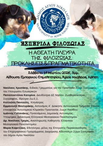 Το Σάββατο 14 Μαρτίου, στις 17:15, στην αίθουσα του Εμπορικού Επιμελητηρίου Λασιθίου στον Άγιο Νικόλαο, θα πραγματοποιηθεί η κεντρική εσπερίδα της διημερίδας με τίτλο «Η Αθέατη Πλευρά της Φιλοζωίας».